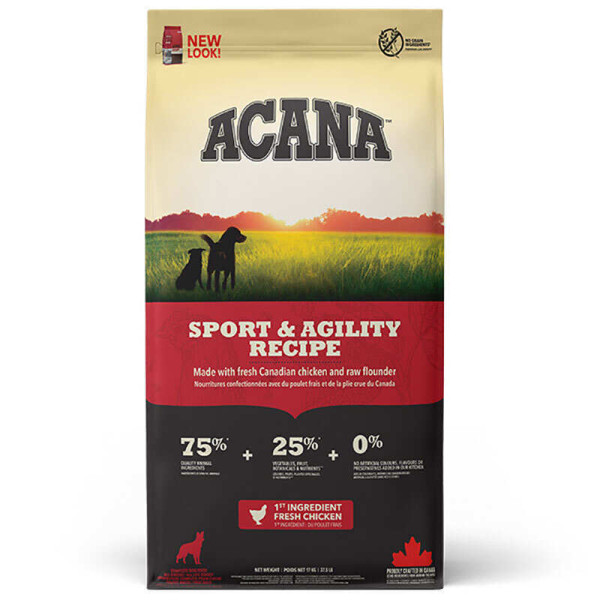 ACANA Sport&Agility Recipe – сухой корм для взрослых активных собак всех пород. Рецептура корма ACANA Sport&Agility Recipe создается с заботой для обеспечения всех потребностей взрослых активных собак в качественном питании. Рецептура корма на 75% изготовлена из мясных ингредиентов, а именно: мяса канадских цыплят и сырой камбалы и на 25% из сбалансированных фруктов, овощей и трав. Этот рацион обеспечит вашего питомца необходимыми нутриентами и протеинами для поддержания отличного здоровья.