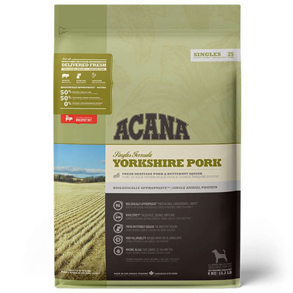 ACANA Yorkshire Pork – сухой гипоаллергенный корм для всех пород и возрастных категорий со свининой. Корм подойдет для собак с чувствительным пищеварением. Рацион на 50% состоит из мяса канадской свиньи, являющегося единственным источником легкопереваримых протеинов.