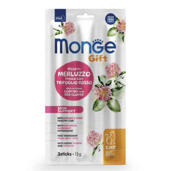 Monge Gift Cat Skin Support (Треска с красным клевером) - это дополнительный корм для взрослых кошек.