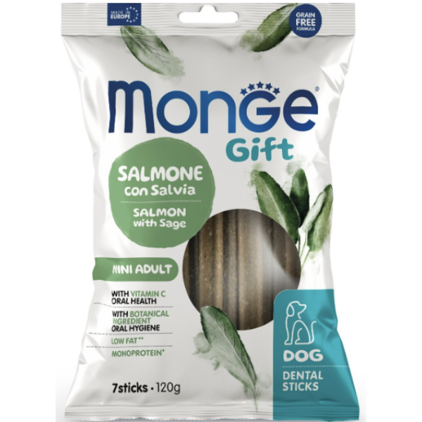 Monge Gift Dog Mini (Лосоcь с шалфеем) - это дополнительный корм взрослых собак миниатюрных размеров.