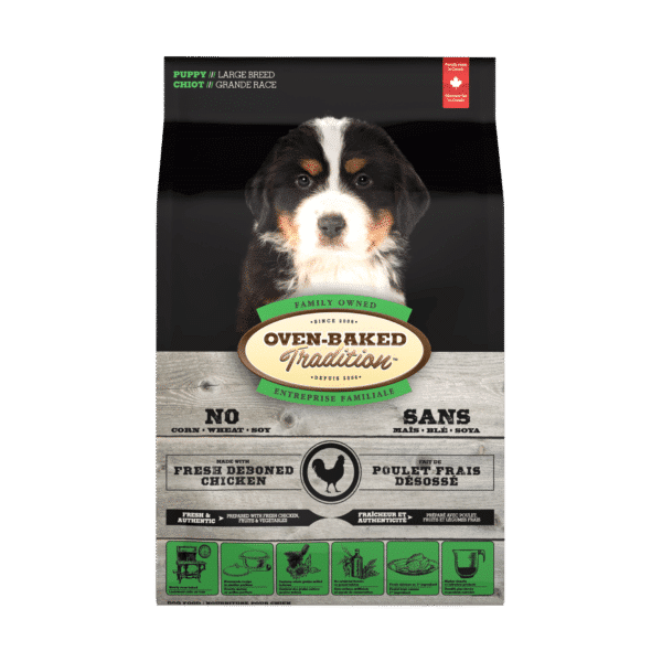 Oven-Baked Tradition Puppy Large Breed - Полнорационный сухой корм со свежим мясом курицы, фруктами и овощами для щенков крупных пород возрастом от 6 недель до 12 месяцев. Изготовлен по технологии медленного выпекания в печи при низких температурах, благодаря чему концентрация питательных веществ в каждой грануле намного больше, нежели в обычных сухих кормах.